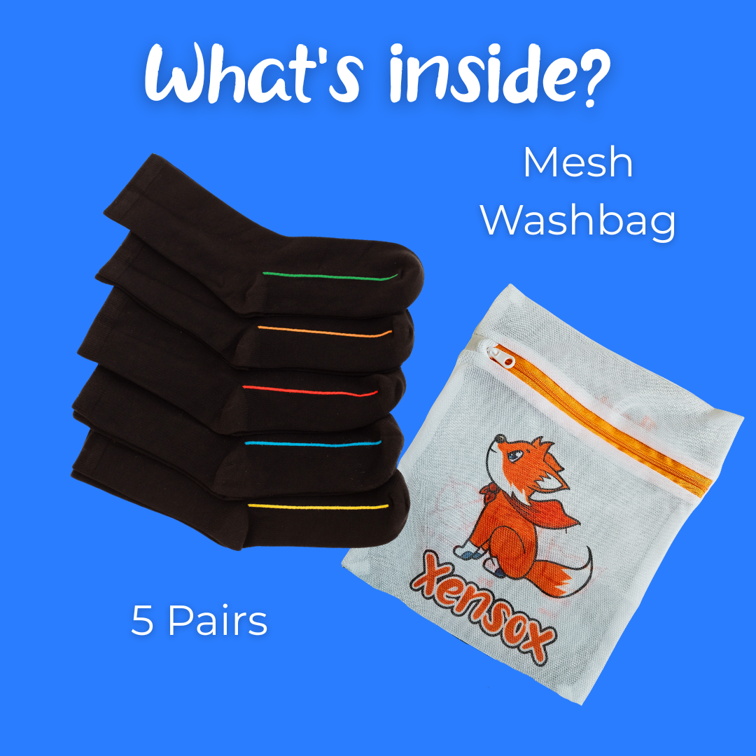 These socks are perfect for school or everyday wear. Made from a blend of bamboo and elastane, they are soft and breathable to keep feet comfortable all day long. The guiding lines make them easy to slip on in a hurry. Available in a pack of five pairs, they come in classic black, white, blue or grey with subtle stripes for a simple yet stylish look.